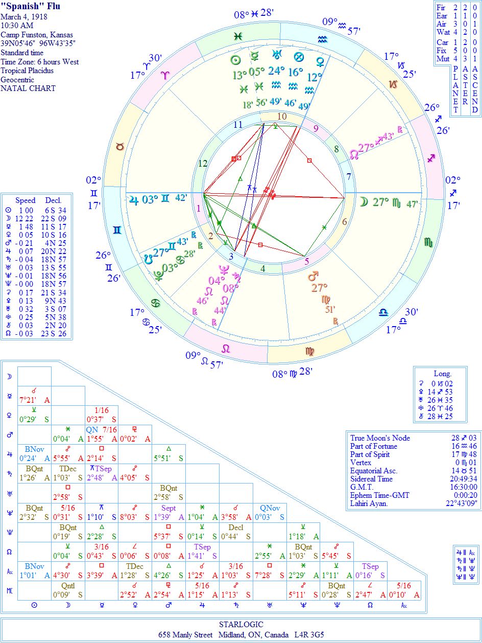 Did you even imagine that we’d still be dealing with COVID-19, two years later? If history is anything to go by, that would be par for the course. I thought it might be informative to look at the ‘birth’ chart of the “Spanish” flu, as generally accepted.