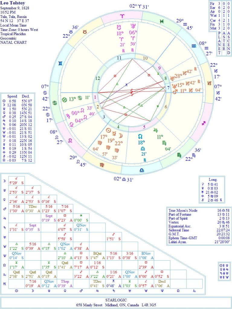 All astrology sites list 10:52 pm as Tolstoy’s birth time, and all of them mark the accuracy of that time as DD, in other words, unreliable. Even my Kepler 7.0 program had this time, so I’m not going to change it. As a result, there is only one inconjunct, and since it involves the Midheaven, it may not actually exist, if the time was wrong. (Note that Saturn is conjunct Venus in Leo…)