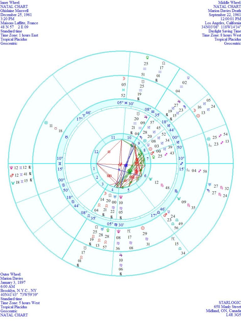 I’ll let the other astrologers out there make whatever connections they can see, but now I want to make what I can only claim as a cosmic leap into the unknown. As I was reading Hearst’s bio, I decided to check on Marion Davies’ life and death. That’s when I thought of Ghislaine Maxwell.