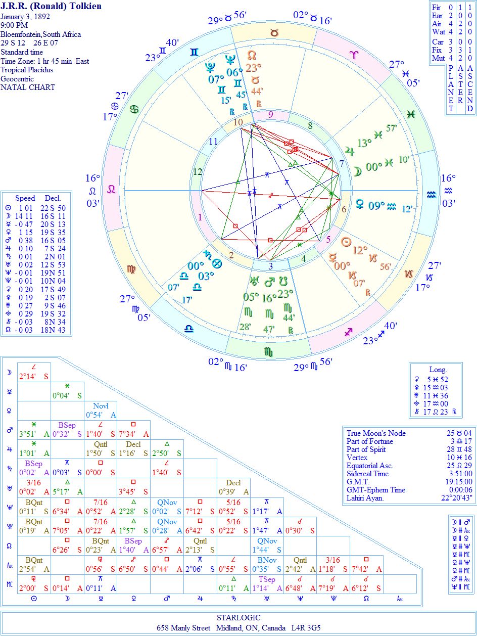 It turns out that another astrologer (Rodden) rectified Tolkien’s chart by one hour (10 pm) which aligns his Venus to the age of 16 years, when he met the woman he was to marry.
