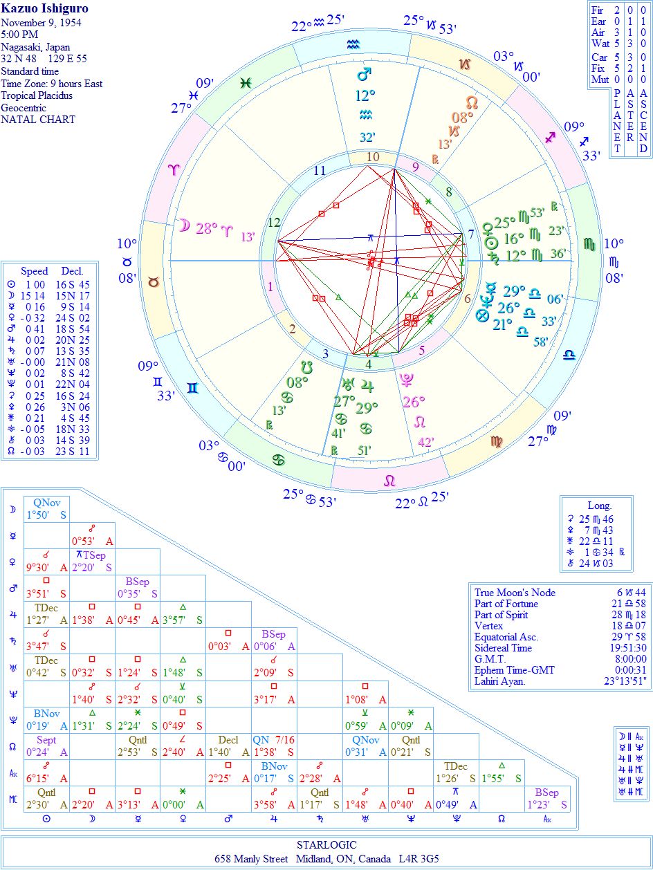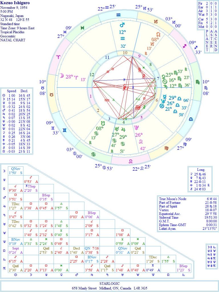 I’m surprised that none of the astrology sites have rectified his chart, based on his life’s story. To me, it was obvious that his moving to Guildford, Surrey at age 5 would be symbolized by Jupiter. Gaining naturalized British citizenship at age 29 is symbolized by the Sun, while marrying his wife at age 32 is symbolized by Venus. That makes his birth time at 5 pm local Japanese time, and his Ascendant in Taurus. As a result, there are two inconjuncts, one dependent on a correct timing, the other not.