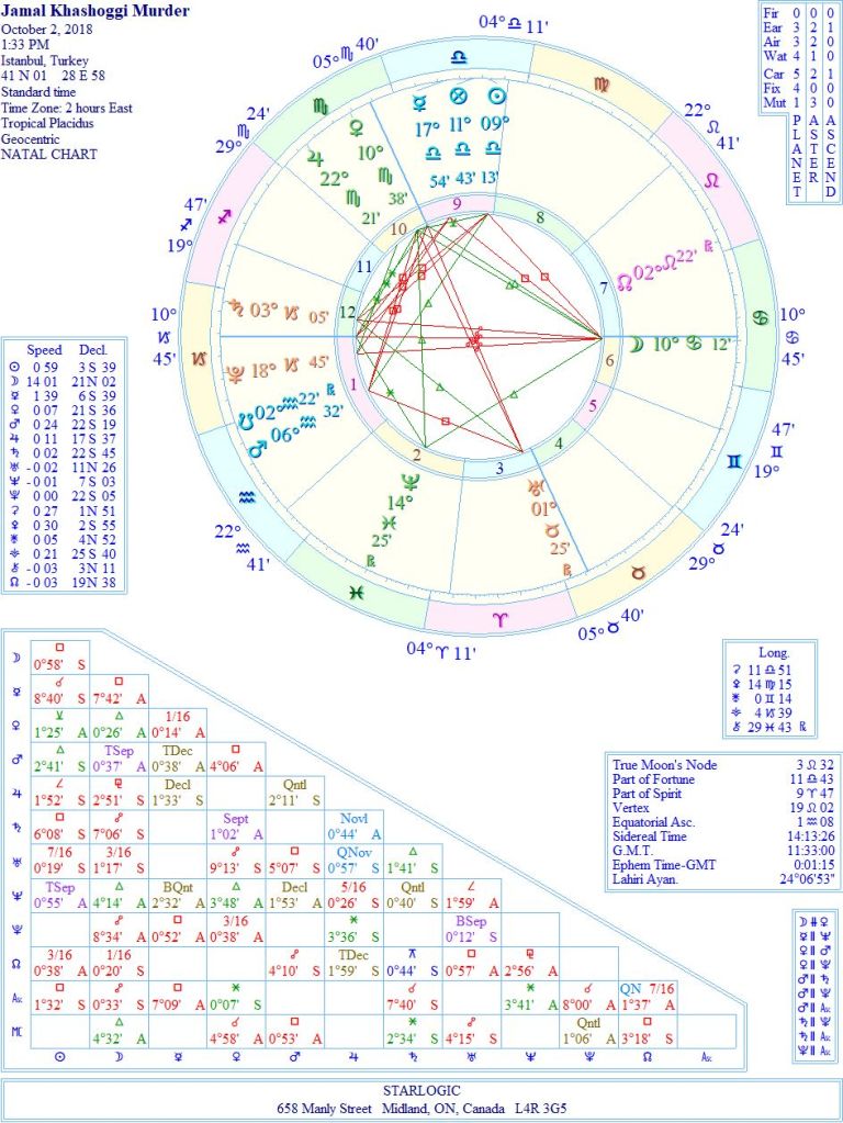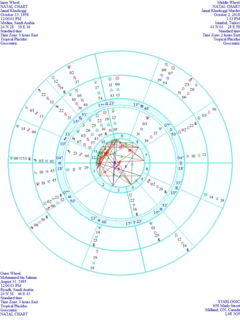 MBS’ Neptune is conjunct both the ‘murder’ Saturn and Khashoggi’s Ascendant. MBS’ Saturn is conjunct the ‘murder’ Jupiter. And MBS’ Sun is conjunct Khashoggi’s Pluto. There are other links, but there’s no point flogging a dead horse, is there?