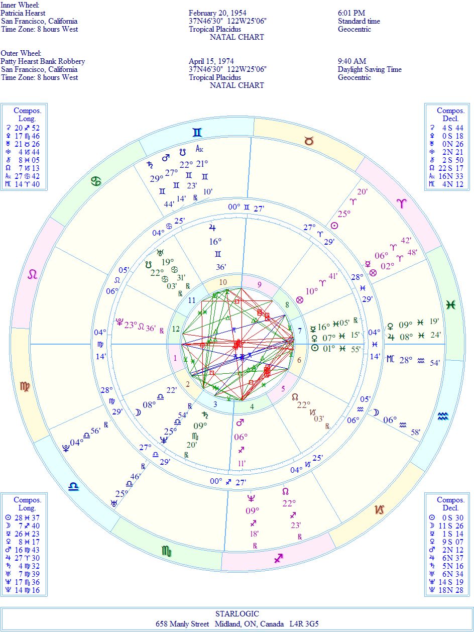 It would seem that this is the time that every astrology site has used for Hearst’s birth chart, so I will stick with it. The first thing to note is that the Sun @ 2° Pisces seems to be when she became her own person at 21 years of age. That coincides with her taking part in a bank robbery after being kidnapped (and brainwashed) by the S.L.A. in 1974.