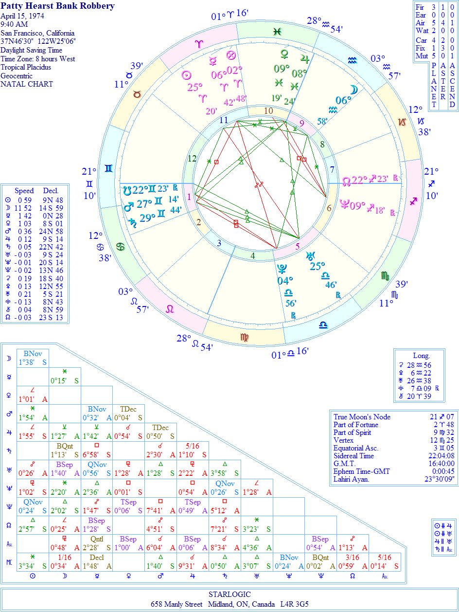 This is the precise moment that the robbery began, as witnessed by the bank guard, Eden Shea. It makes me wonder, when observing the South Node/Mars/Saturn/Ascendant conjunction in Gemini, if this was something Ms. Hearst had done before, in a prior life. At any rate, she had done it again, now.