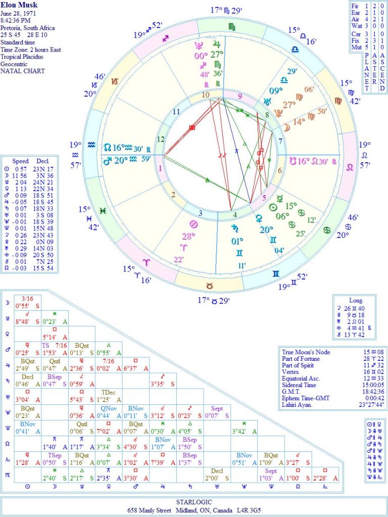 The ‘normal’ time on most astrological websites is 6:30 am. That time represents dawn (or close to it) on the day Elon Musk was born. One intrepid astrologer rectified Musk’s birth time to 20:42:36 and I’m going along with that. Why? Because the North Node is conjunct the Aquarius Ascendant; he’s another child protege. And the Mars conjunction to both gives him the energy to pursue his goals.