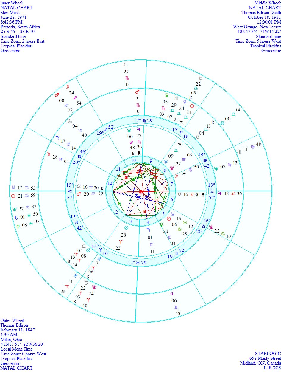 I think the strongest link between these two is the Mars/North Node/Ascendant in Musk’s chart being totally echoed in Edison’s natal Sun/Mercury conjunction. Musk’s South Node is conjunct Edison’s ‘fatal’ Jupiter in Leo. There are other links, but I won’t bore you with the details; just look for yourself.