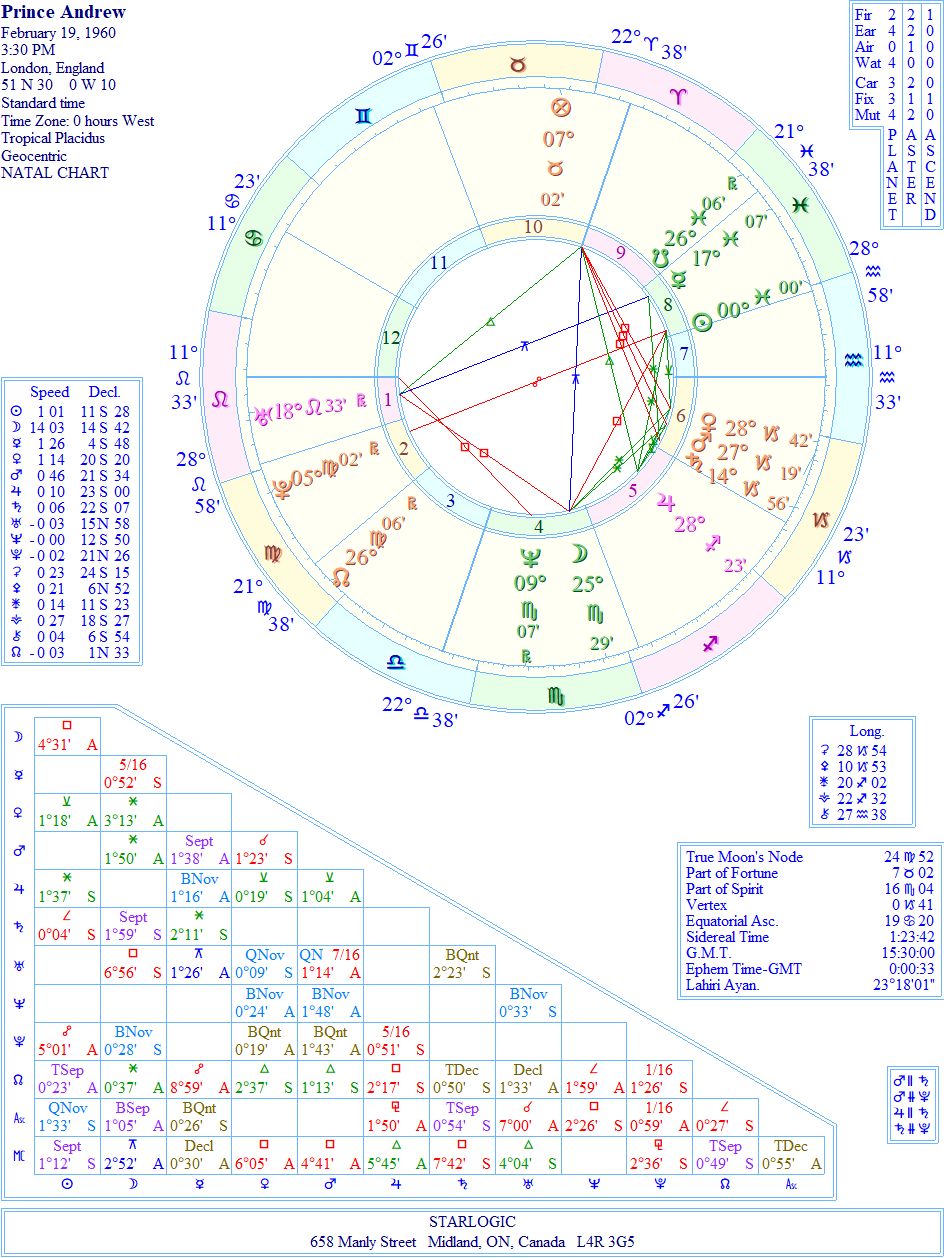 Now, before I start, let me remind you, the reader, that a Venus/Mars conjunction in the birth chart is an indication of a love/hate relationship with the opposite sex. And the placement of this conjunction in Andrew’s birth chart says that this came into play when he was between 17 and 18 years of age. In other words, his first love was complicated. That’s probably why the British tabloid press nicknamed him “Randy Andy”. You can draw your own conclusions about his marriage to Sarah Ferguson.