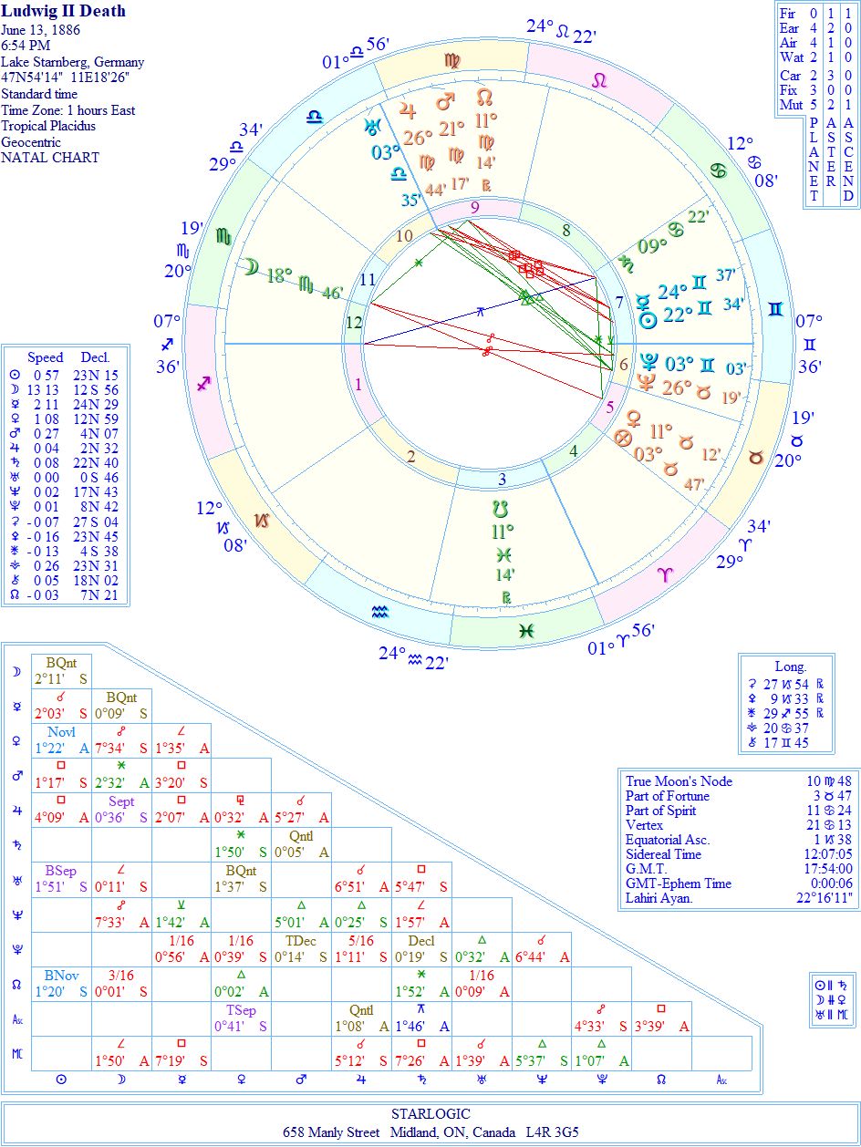 As you might expect the birth chart of this royal has a Yod, pointing at Mercury from inconjuncts to Mars and Neptune on one side and Pluto on the other. So, he might well have been mad, as his other nickname “The Fairy Tale King” implies. He was the one to build many beautiful Bavarian castles, even when he could not afford to.