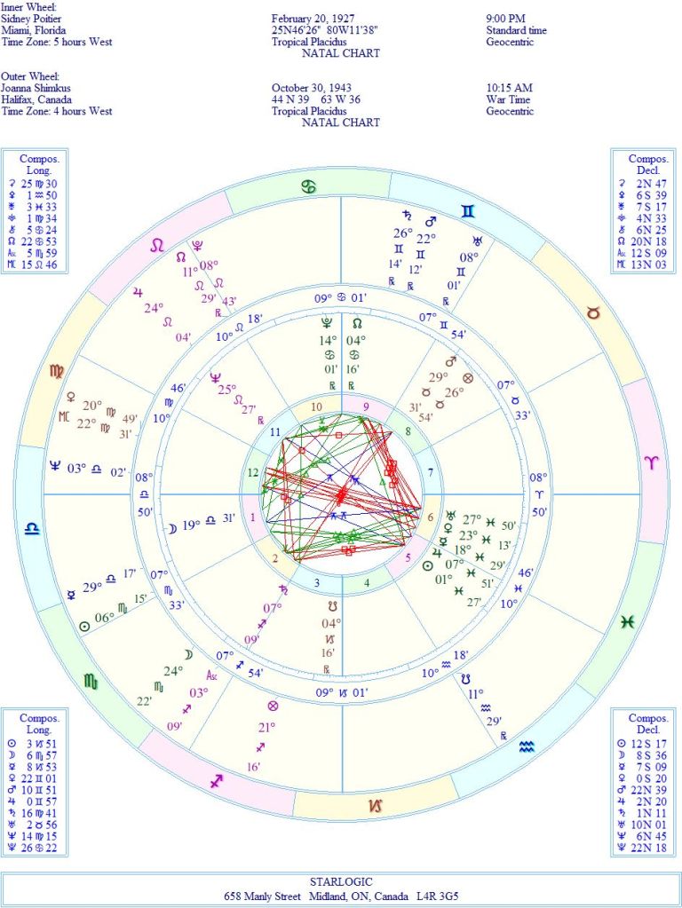 My impression of this relationship is that Saturn plays a strong role for both partners. Mars represents the ‘ideal’ man for a woman and in Joanna’s chart it is conjunct Saturn (both in Gemini). In Sidney’s chart Saturn is on the cusp of his 3rd House, conjunct Joanna’s Ascendant (based on the rectified time, highlighting Mars at age 32). The other link involves Sidney’s Neptune and Joanna’s Jupiter. There are plenty of inconjuncts, but only one interactive Yod: his Uranus and Mars are inconjunct her Mercury.