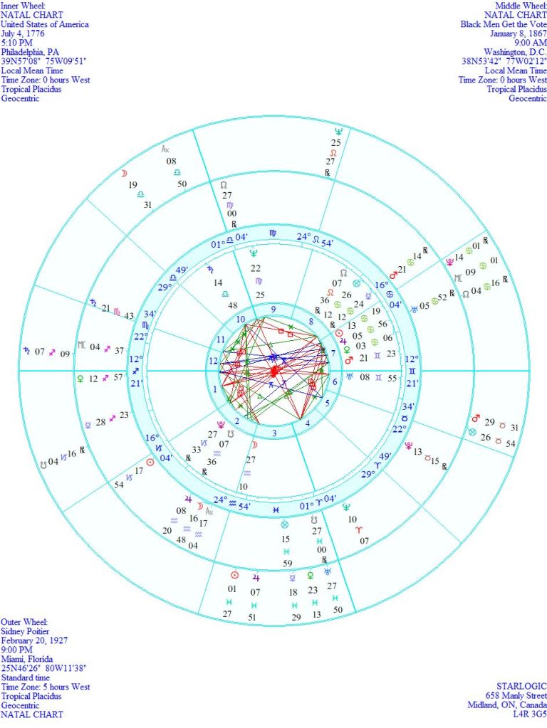 As an experiment, I compared this event chart with the birth chart of the United States of America, and then with the birth chart of Sidney Poitier. I knew they would be connected, so just for fun, here is the triple comparison: