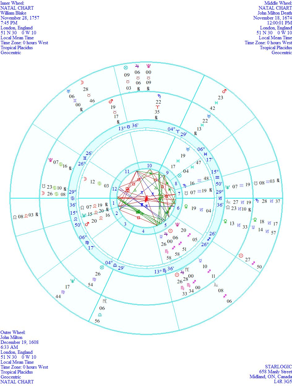 The North and South Nodes being lined up identically in their birth charts is the biggest clue. Milton’s ‘fatal’ Neptune is exactly conjunct Blake’s South Nodes @ 7° Aquarius 19′. Could it be any clearer? There are other connections, but I don’t need to point them out, do I?