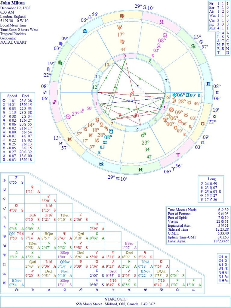 John Milton’s birth chart was already on my Kepler 7.0 computer program, so I haven’t changed a thing. There are three inconjuncts, two of which form a Yod, directly pointing at Jupiter in the 5th House.