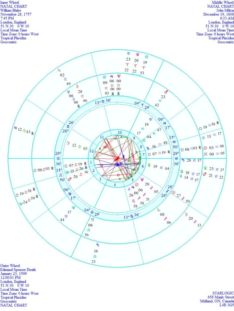 The connections between Spenser and Milton are tenuous, but adding Blake to the mix shows the true line-up between Milton’s and Blake’s birth charts and Spenser’s death chart. Who’d have thought it?