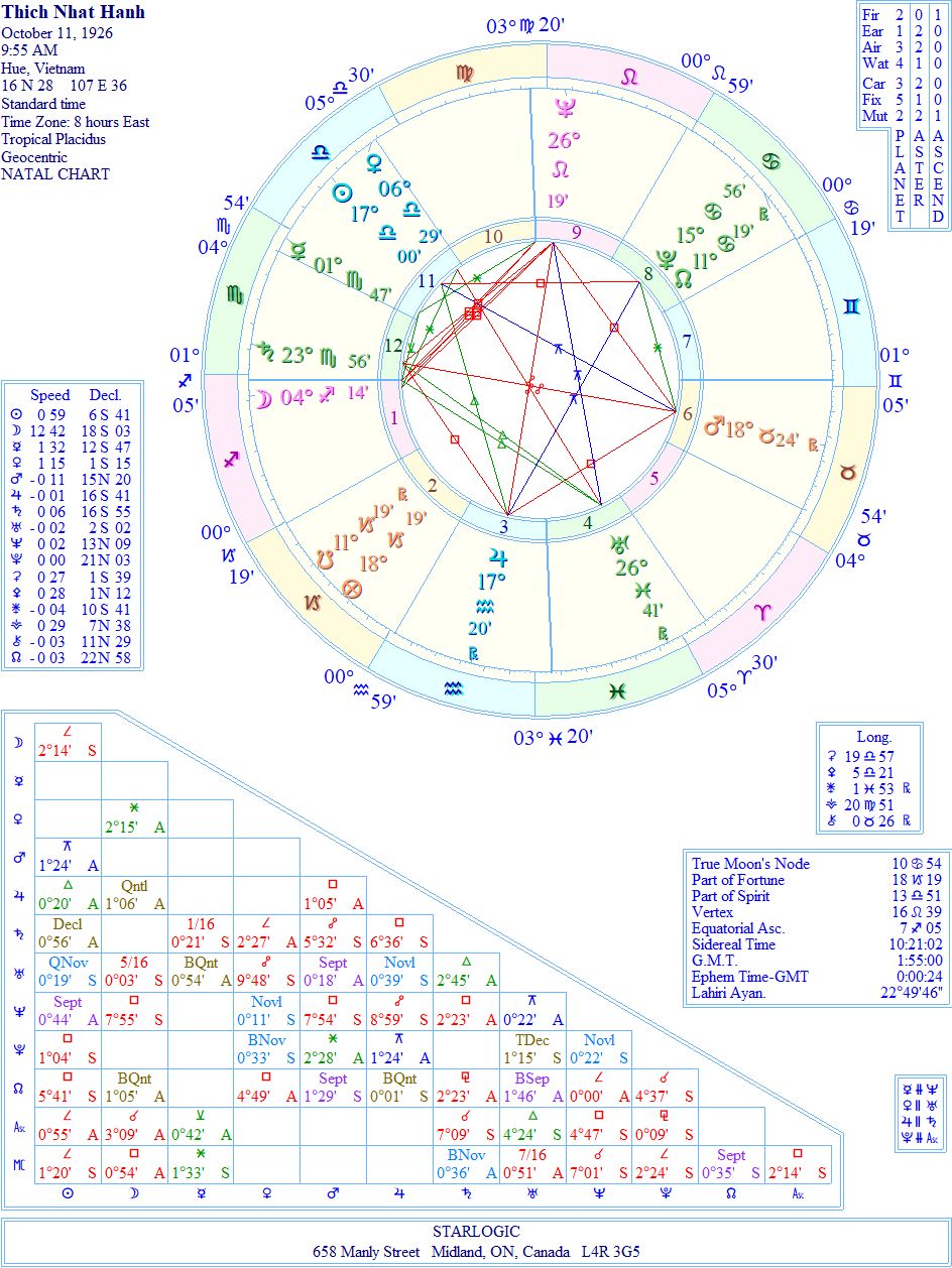 Thay’s birth time is unknown. Most astrology sites then settle on 12 noon for his birth chart. I got the impression that his becoming a monk at age 16 would be symbolized by Mars @ 18° Taurus 24′. (It makes him a spiritual ‘soldier’ here on earth.) I was surprised to see three inconjuncts, none of which are dependent on the correct time of birth.