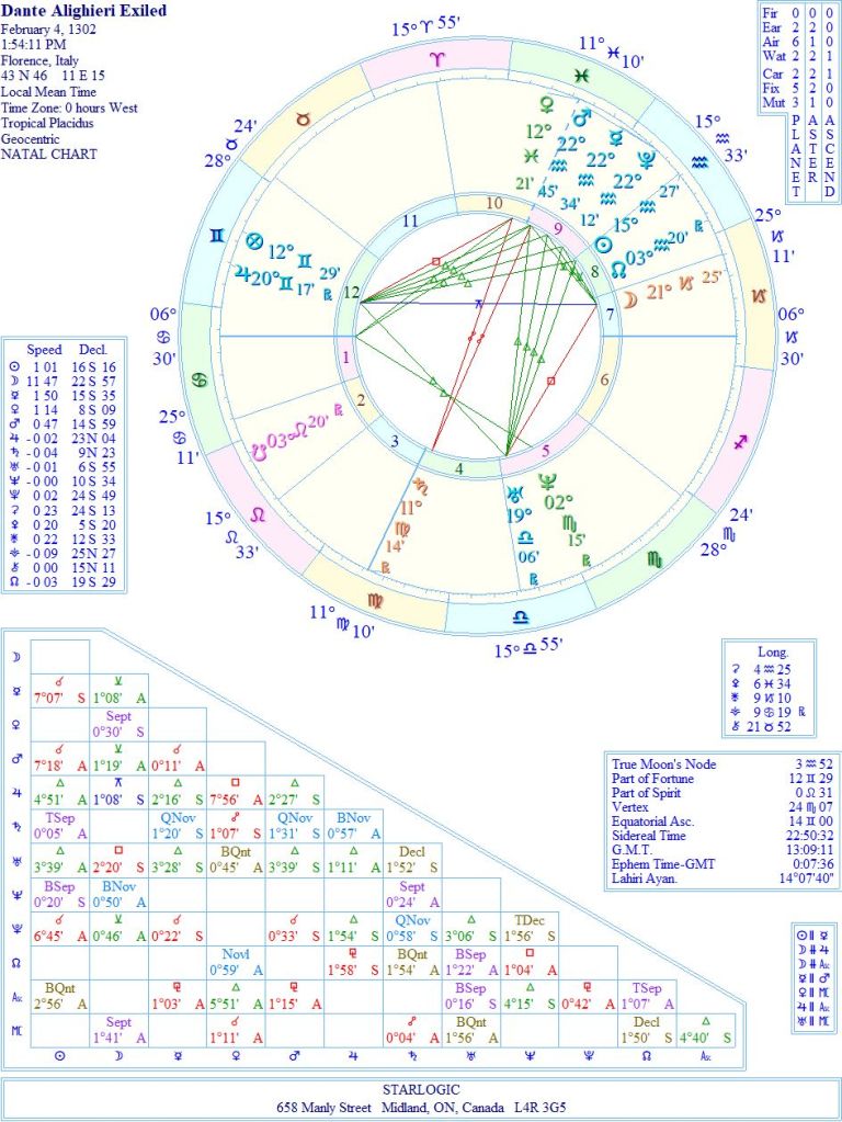 Dante’s birth date is approximately between May 21 and June 20, 1265. On a hunch, I chose May 31 (OS) which equates to June 7th (NS). The timing of his birth is randomized. As for his death, that is better known, although I set the time for 12 noon.
