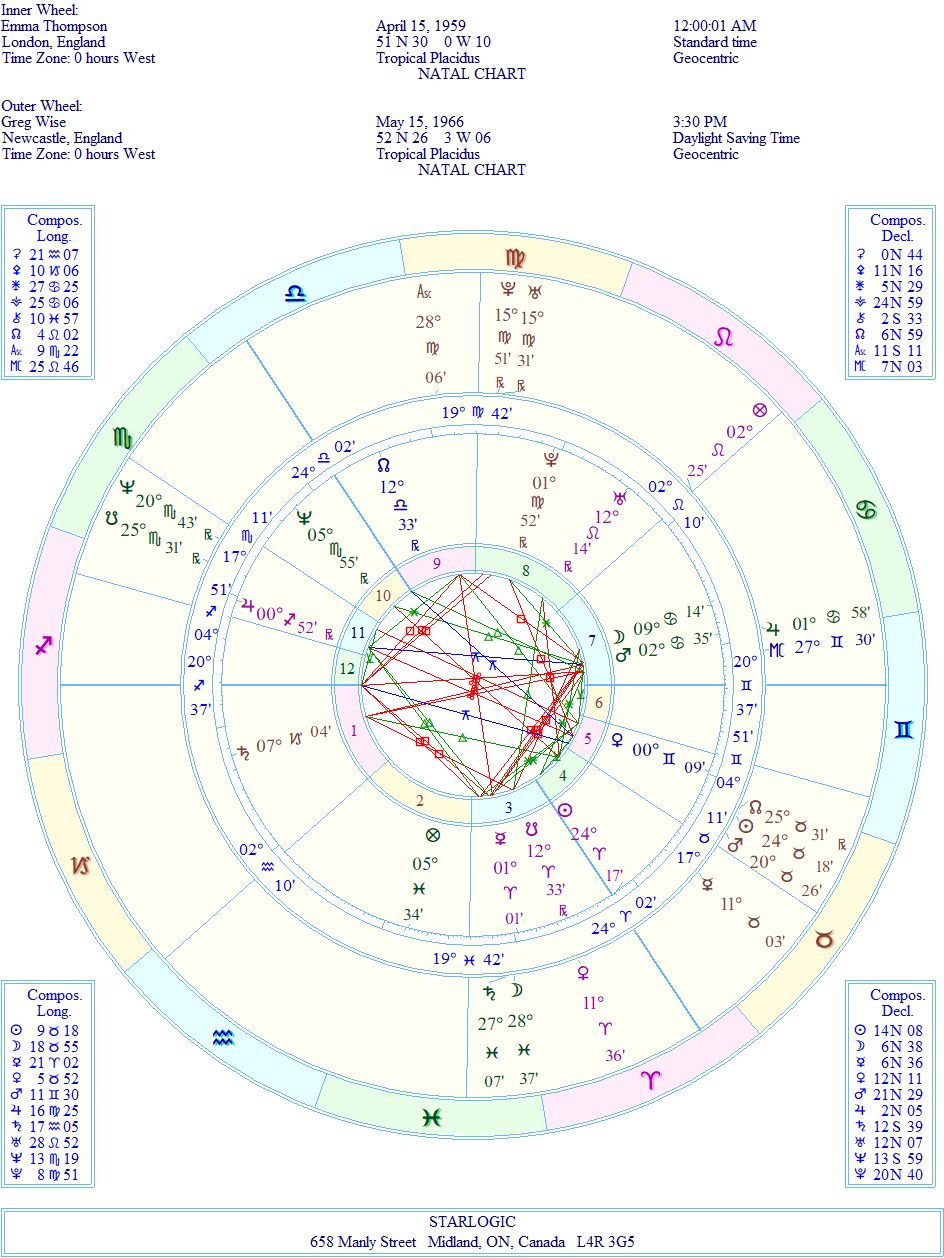 The Uranus/Pluto conjunction @ 15° Virgo in his 12th House is probably the attraction for most of the female population. (I don’t share their enthusiasm.) When I compared his chart with Emma’s I got this: