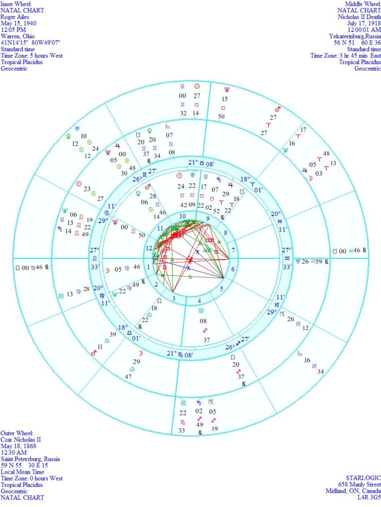 Yes, there are connections, but are there enough to prove reincarnation? Perhaps not, but Ailes’ Moon being within 5° of Nicholas’ natal North Node should tell us something. Their natal Suns are within 3°. Nicholas’ natal Neptune is about 2° from Ailes’ South Node (@ 18° Aries). The natal and fatal charts don’t link up quite as easily. Perhaps being assassinated can mess reincarnation links up a bit.