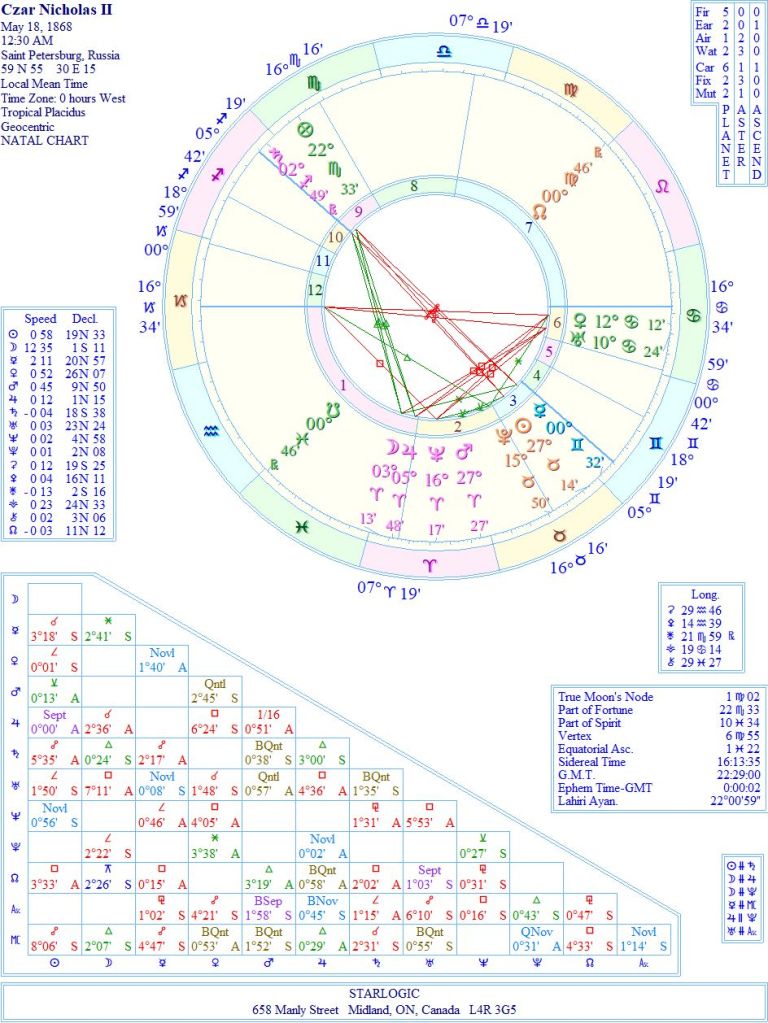The obvious thing is Saturn on the cusp of the 10th House: he was born to rule over others. And his marriage to Alexandra (Venus) seems to be situated for 20 years, not 26 as it should have been. They first met when he was just 16 and she 12.So there are lots of holes in the astrological story of this man.