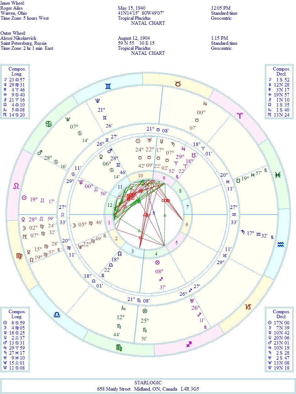 Yes, there are connections, but are there enough to prove reincarnation? Perhaps not, but Ailes’ Moon being within 5° of Nicholas’ natal North Node should tell us something. Their natal Suns are within 3°. Nicholas’ natal Neptune is about 2° from Ailes’ South Node (@ 18° Aries). The natal and fatal charts don’t link up quite as easily. Perhaps being assassinated can mess reincarnation links up a bit.