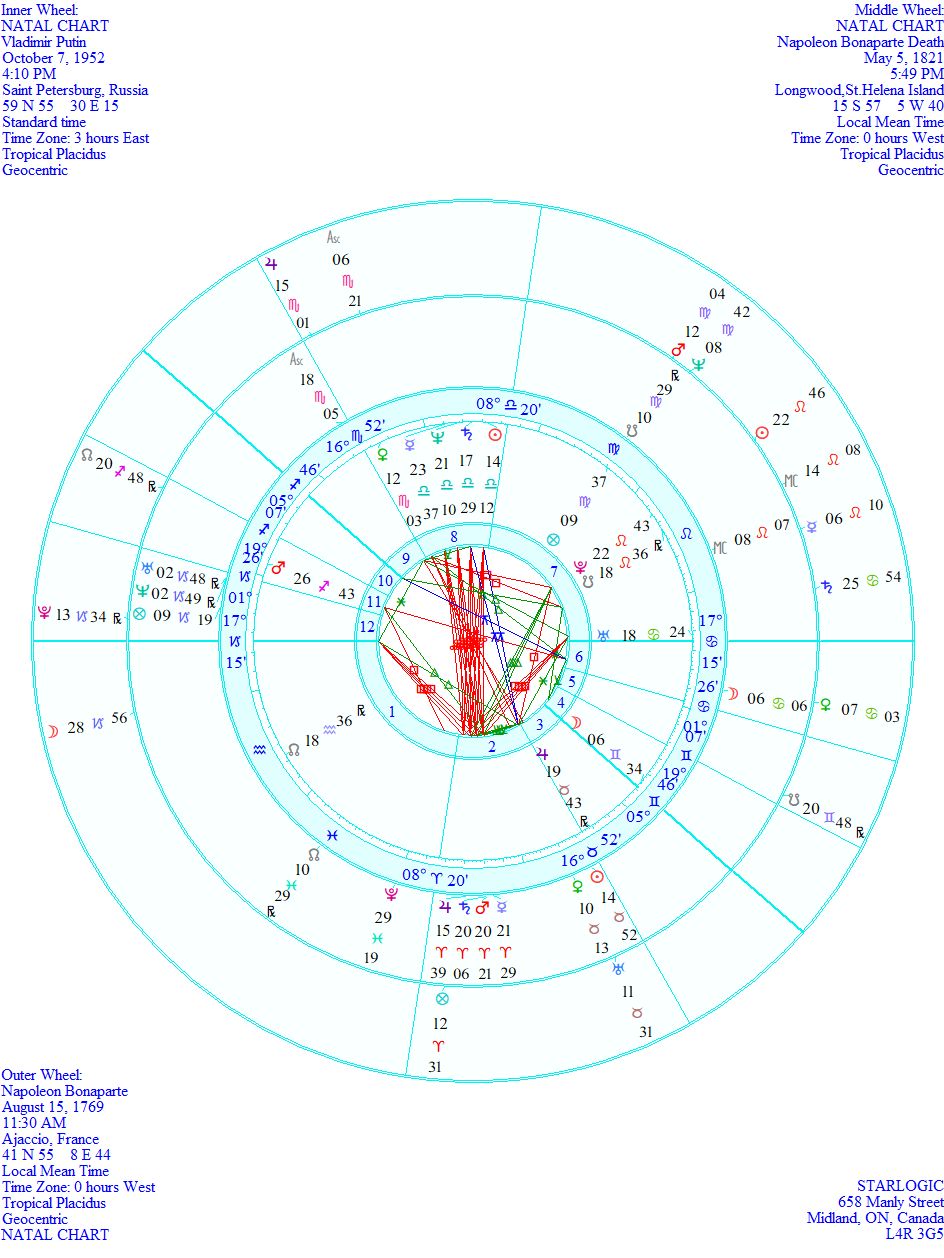 Putin’s Part of Fortune aligns with Napoleon’s ‘fatal’ South Node and his natal Mars and Neptune conjunct. Napoleon’s natal Part of Fortune is conjunct his ‘fatal’ Jupiter and opposite Putin’s Sun. And the proof of reincarnation? Putin’s Mars is within 6° of Napoleon’s natal North Node.