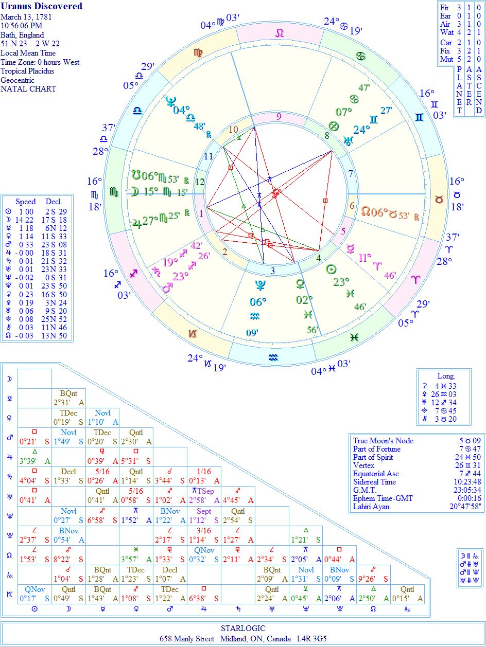 If you can follow my logic, I randomized the timing of this chart and then changed a.m. to p.m. His discovery was at night. The chart above shows Uranus above the horizon in the western sky just about the time that the Moon was rising in the east. Does that make sense? (I trust the randomizing effect, as it has been proven right 90% of the time.) In fact, Uranus is the only planet in the western sky that night.
