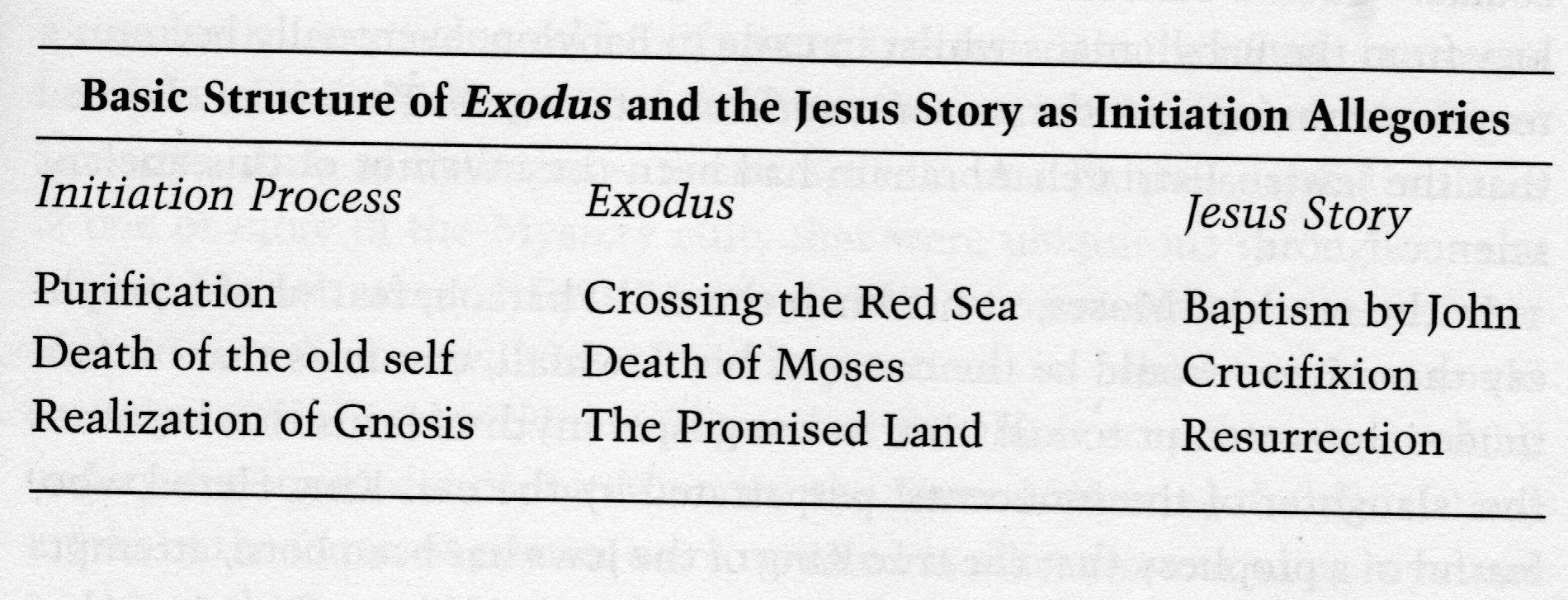 The basic structure of the Exodus allegory, representing the fundamental stages of Gnostic initiation, is the framework upon which the Jesus myth was constructed. The first stage of initiation is one of purification and struggle. In the Exodus myth this is the crossing of the Red Sea, which inaugurates 40 years of wandering in the wilderness. In the Jesus story, this stage is represented by Jesus’ baptism, followed by his 40 days in the wilderness. The nest stage in the process of initiation is the ‘death’ of the old self which precipitates Gnosis. This is represented in the Exodus myth by the death of Moses and in the Jesus myth by the death of Jesus on the cross. The experience of Gnosis is represented in Exodus by Jesus [Joshua] crossing to the Promised Land and in the New Testament by Jesus’ resurrection from the dead and ascension to Heaven.