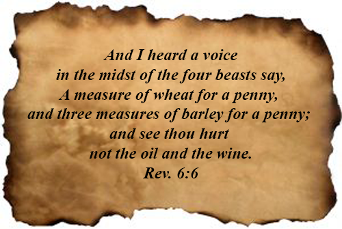 ESV Comment – Do not harm the oil and wine: Local crops such as oil and wine are unaffected, showing that the scarcity is limited, not comprehensive. Some think the command not to harm the oil and wine may have a social significance, since the rich were the primary consumers of oil and wine. It could also be a prediction of events like that of A.D. 92, when the emperor Domitian during a grain shortage ordered the vineyards cut down to make room for more wheat fields. This caused such a backlash that he rescinded the order. In other words, extreme measures would have to be taken due to the progressive pouring out of judgment.