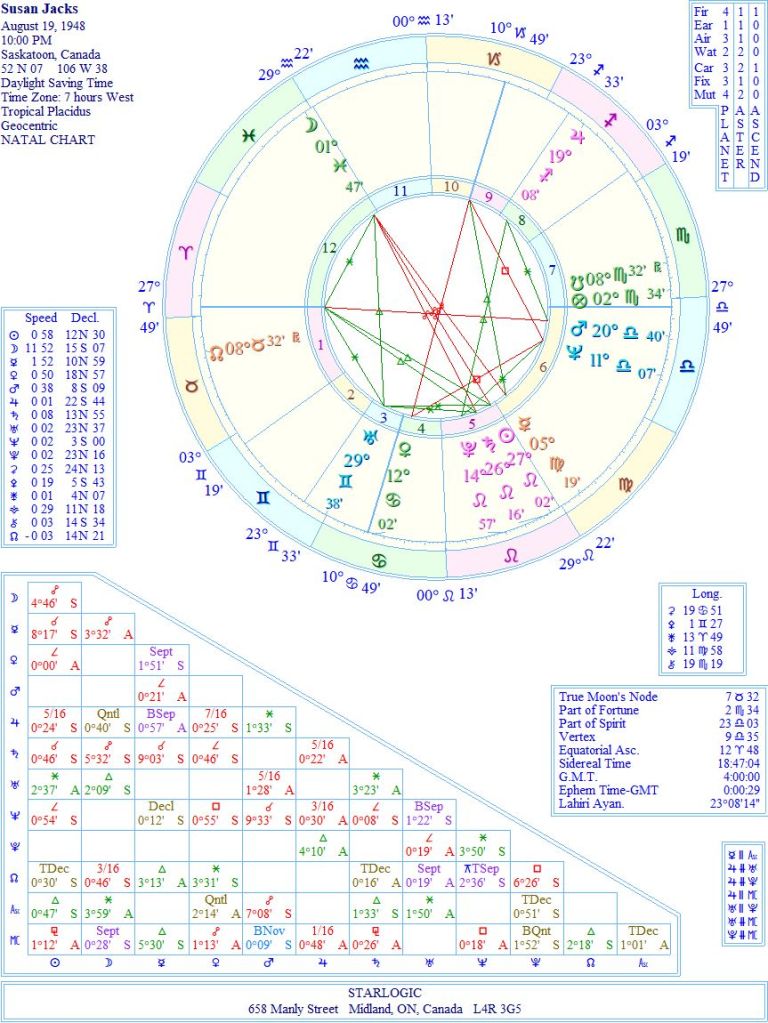 Her birth time is unknown, so I have rectified her chart to show her becoming a musical star @ 16 (Neptune) and marrying Terry Jacks @ 19 (Mars). This looks right. Notice that there are no inconjuncts.