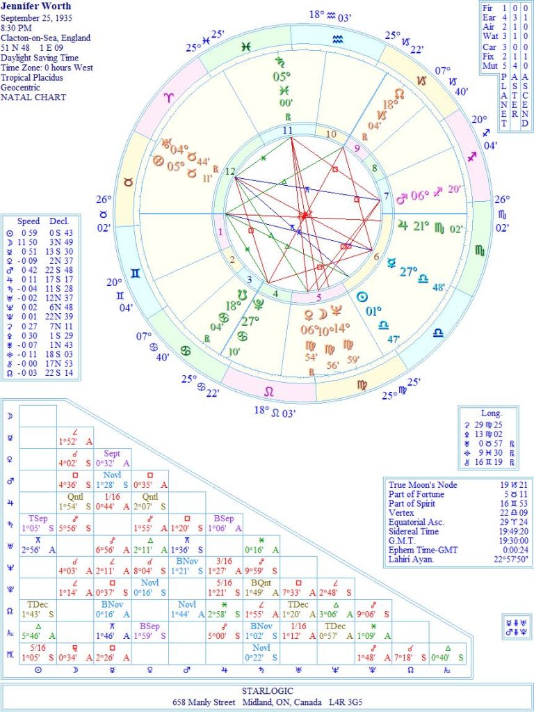 As you might expect, Jennifer Worth‘s birth time is unknown, so I have rectified her chart to show the age (28) when she married her husband Philip (Mars). There are three inconjuncts, two of which form a Yod, pointing at Uranus. The remining one is dependent on a correct birth time, but ‘feels’ right..