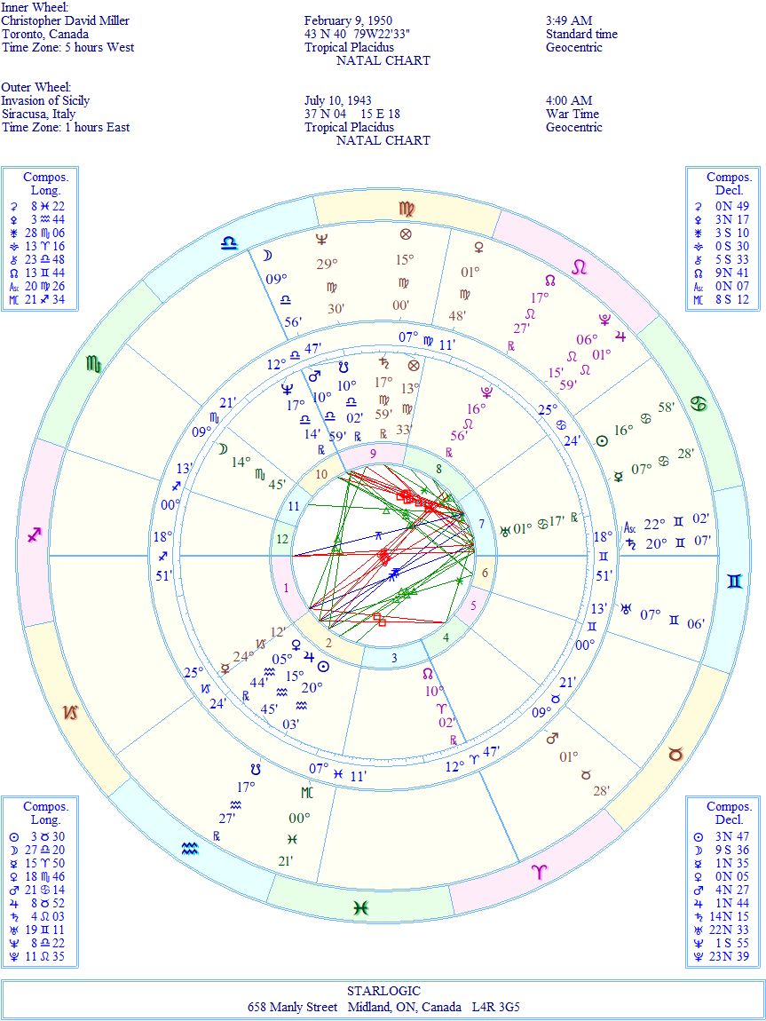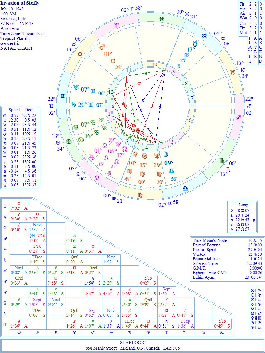 The ‘event’ South Node is @ 17° Aquarius, in the middle of the Sun/Jupiter conjunction in my natal chart. (This is proof that Operation Husky is in my wheelhouse, as they say.) The ‘event’ Moon is conjunct my natal Mars/South Node conjunction. The ‘event’ North Node is conjunct my natal Pluto. The ‘event’ Saturn/Ascendant conjunction is conjunct my Descendant. This is definitely connected to me. But does it matter to anyone else? Well, yes, because there would have been no D-Day without it.