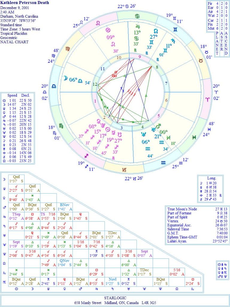 My astrologer friend, Ellie, would have a field day with this chart. But the curious thing is that Mars (symbolic of accidents and violence) is totally un-aspected and sitting in the 5th House. Hmm.
