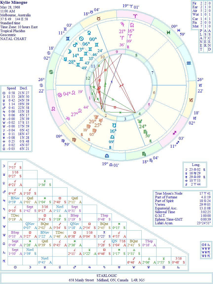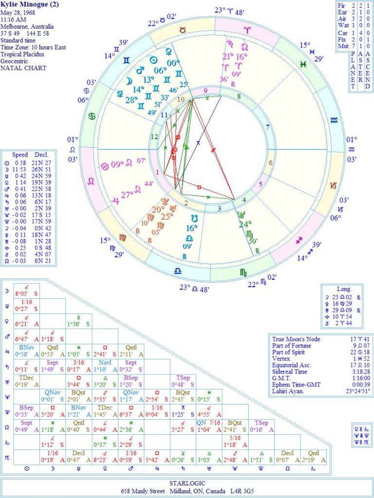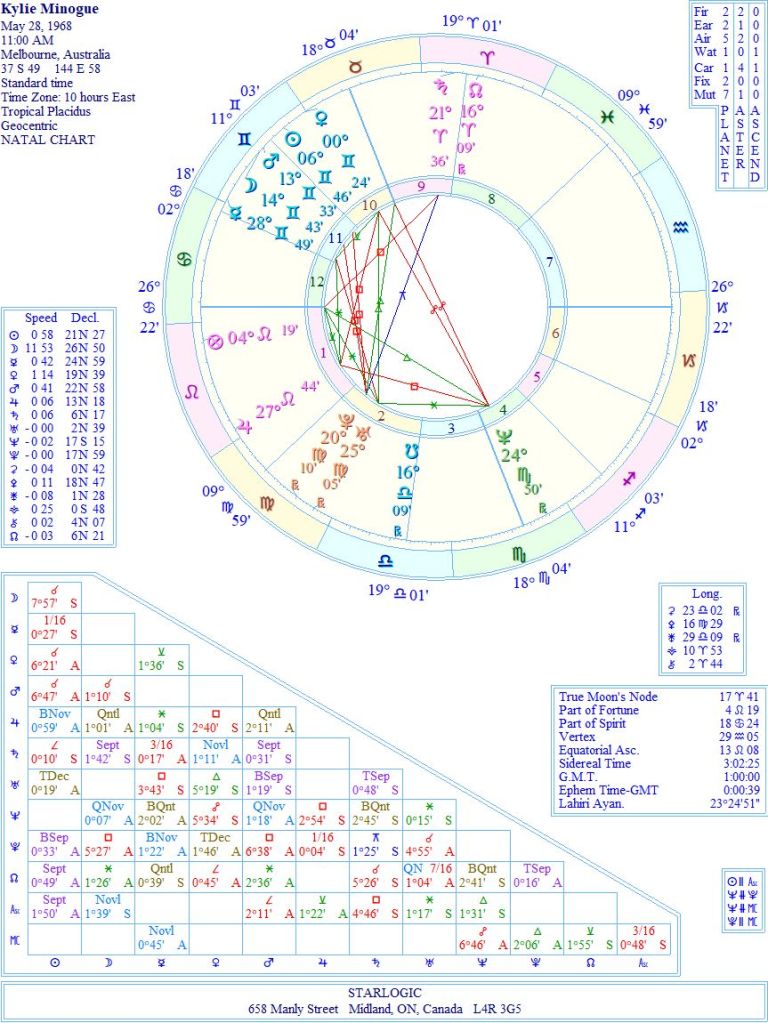 There may have been two reasons for this slight alteration of time: 1) Kylie projects a more ‘look at me’ energy that comes from a Leo Rising; and 2) the Neptune position in her chart represents the age of 10 when she got into showbusiness. But, who’s to know for sure? Certainly the T-squares pointing at Jupiter from the Neptune and Venus/Midheaven oppositions, speaks to me of her world-wide popularity. But the earlier timing only loses the Jupiter/Midheaven square, as the rest is intact.