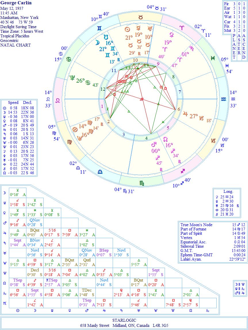 That Grand Trine is the giveaway: Mars @ 0° Sagittarius; Saturn @ 1° Aries; and Pluto @ 26° Cancer. Leo Rising allowed this Taurus Sun and Gemini Moon individual to shine a bright light on our foibles. And, oh, how he did. He was a one-in-a-million standup comedian, with NO HIDDEN AGENDA.