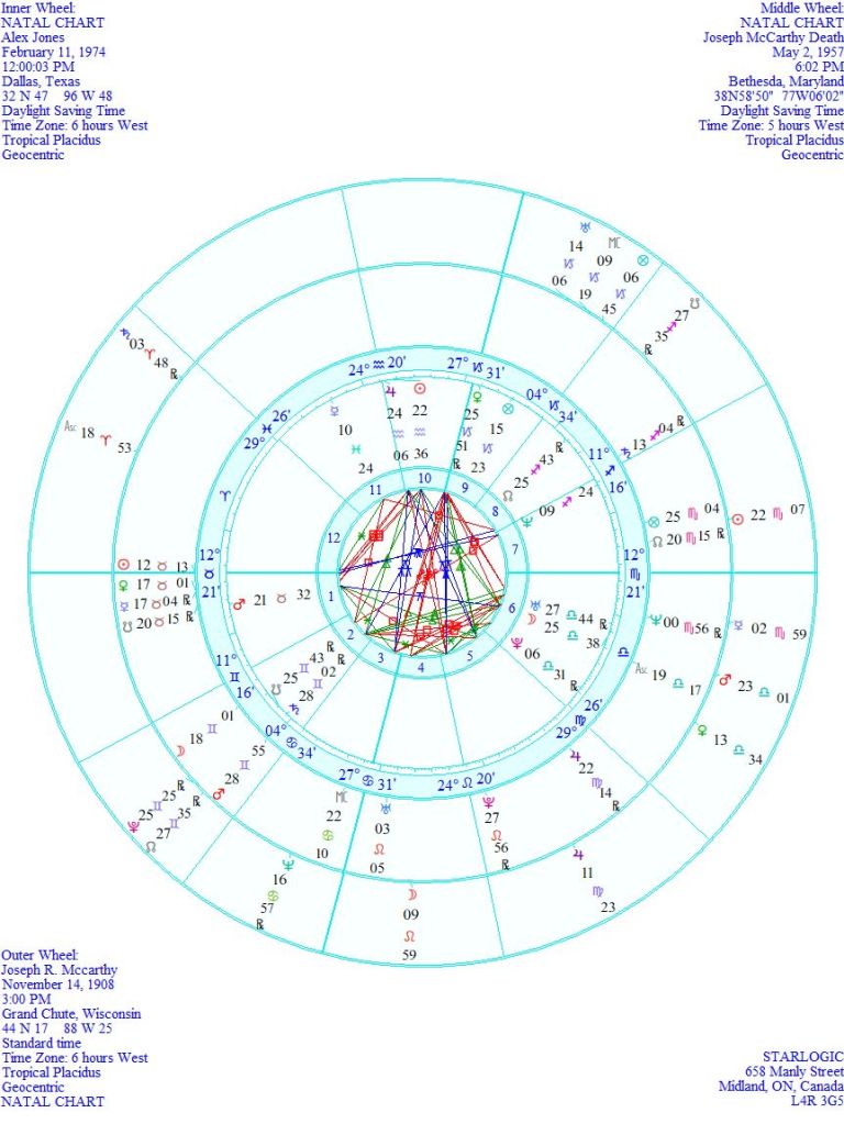 I have reduced the number of times that I have made karmic connections between people over time. But in this case, I think it’s justified, because the Nodes are aligned but reversed, a clear indication of reincarnation. And Joe’s ‘fatal’ Sun being exactly conjunct Alex’s Ascendant may be a coincidence (or not). The other links are interesting and widely arrayed. I definitely think we are on solid ground.