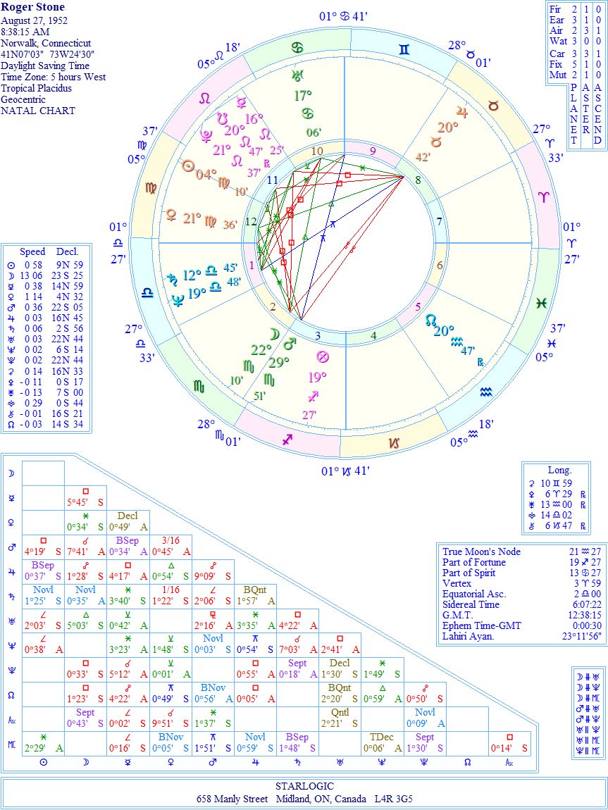 This timing is 100% randomized. But there are a couple of interesting points that I want to share. If the time of Stone’s birth is anytime other than this, the Moon and Mars will be conjunct (using the 10° arc, before and after). Therefore, the accidental inconjunct between Mars and the Midheaven may be applicable, here. The other inconjunct linking Jupiter and Neptune is not dependent on an exact timing. Also, note that Jupiter seems to be pivotal to most of the aspects, while Saturn and Neptune are in Stone’s Libra 1st House. This might explain why he is a conspiracy theorist.