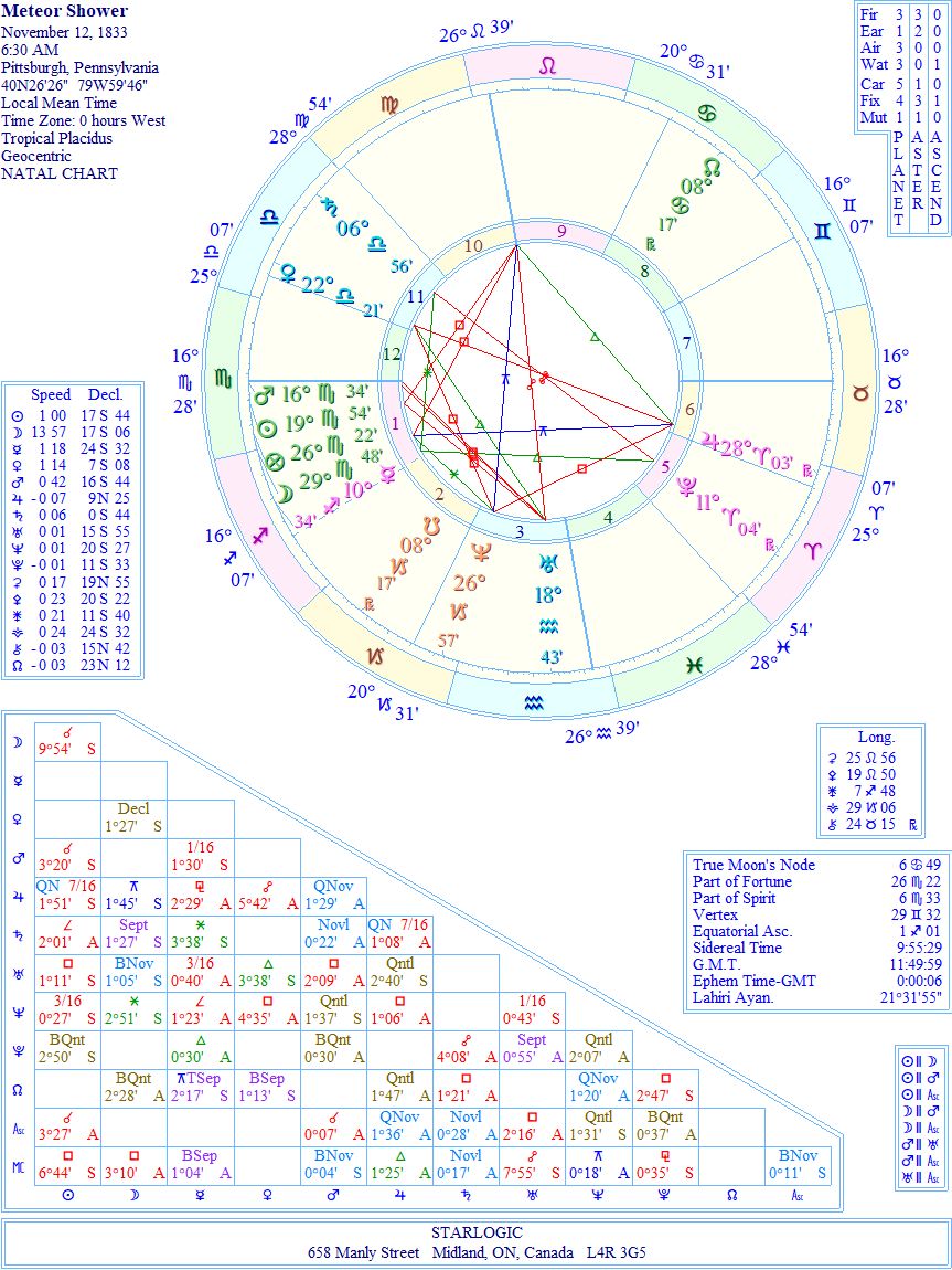 The time was ‘just before dawn’. So, I have chosen 6:30 am local time in Pittsburgh because the Gazette wrote about it. The Mars conjunct Scorpio Rising seems appropriate, doesn’t it? There are two inconjuncts.