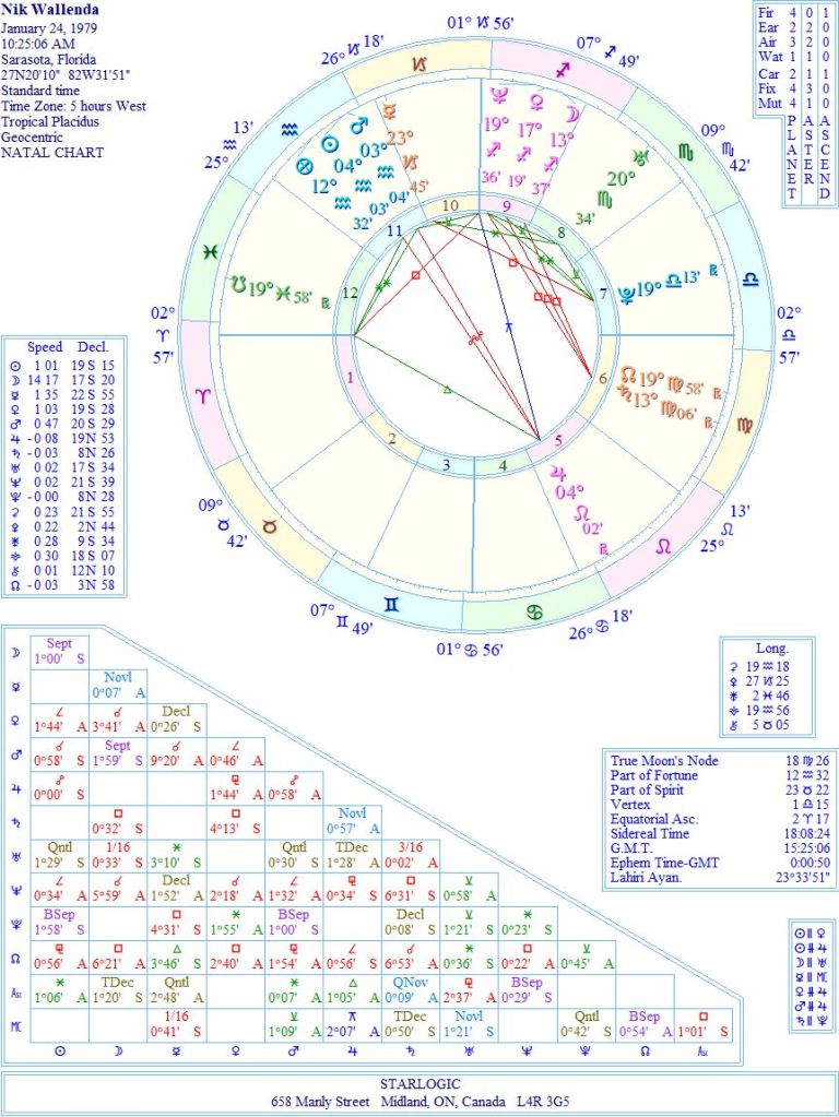 The timing of this chart is 100% randomized. The Pluto position relates to his attempts to be the first to do these tightrope walks at about age 33. So, I’m not going to further rectify the chart. There’s one inconjunct (but it’s dependent on an accurate time, so it might not apply, except I think it does).