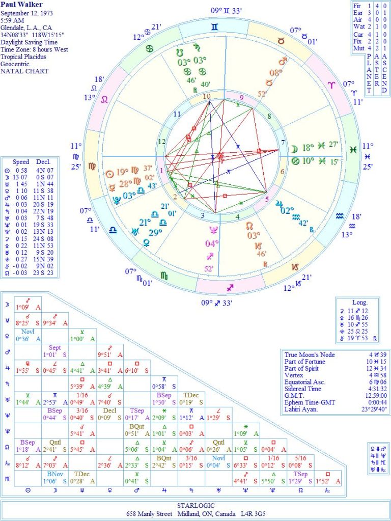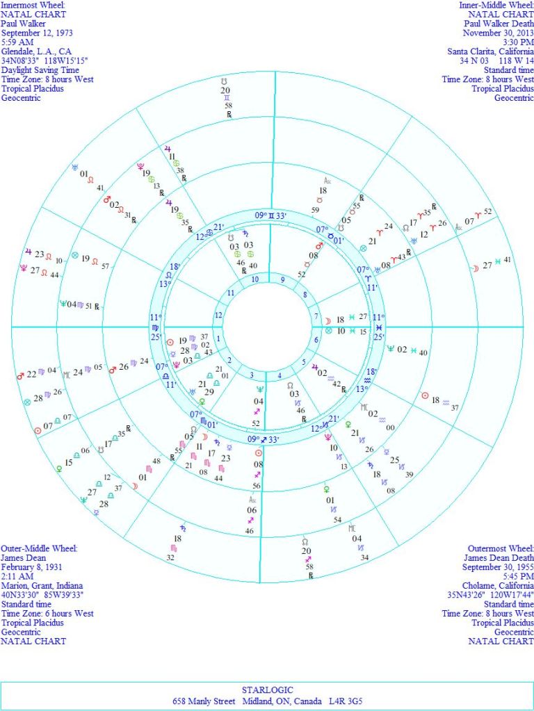 That’s a pretty impressive set of aspects between them. So, in a word, I think Paul is the reincarnation of James, and the only difference is that James Dean died behind the wheel, and Paul Walker was a passenger. Imagine how that would play out for their joint soul in their life reviews. Yes, that’s both sides of the equation: the Driver and the Driven. Rest in Peace, fellas.