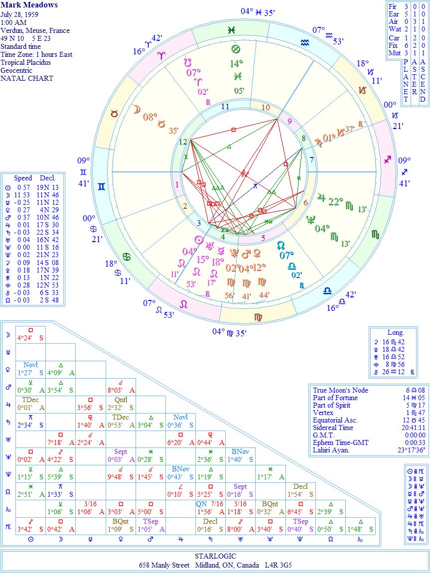 That Cosmic Cross aspect linking the Sun, the Moon, Neptune and the Midheaven shows that Meadows is stuck with his situation. The timing of his birth chart is considered excellent. There is one inconjunct.