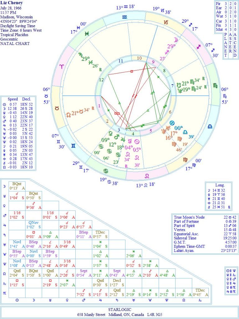 There is also a close conjunction between the South Node and Neptune in Scorpio, which may give us a clue about a past life connection. I can only wonder, for the moment, what that entails. However, the straight shooter designation comes from Ms. Cheney’s Moon being in the final degree of Sagittarius.