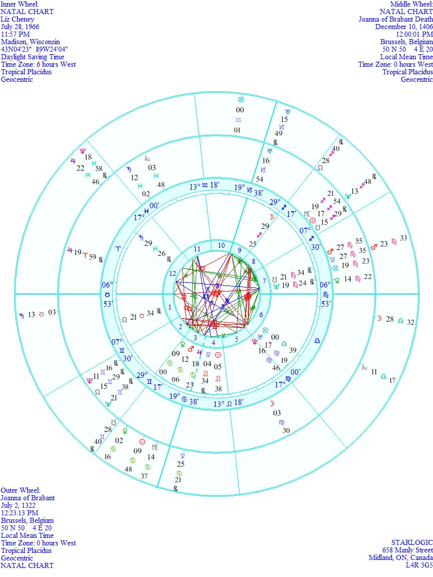 There is no record of Joanna’s birth time, so I randomized it. The Ascendant and Midheaven positions may be completely spurious, but for our purposes completely accidental. There are two interactive Yods pointing at Saturn @ 13° Taurus and Neptune @ 13° Sagittarius. Hmm. The timing may be correct after all. And the position of Mars @ 23° Scorpio may also be significant, when compared with Liz Cheney’s birth chart.