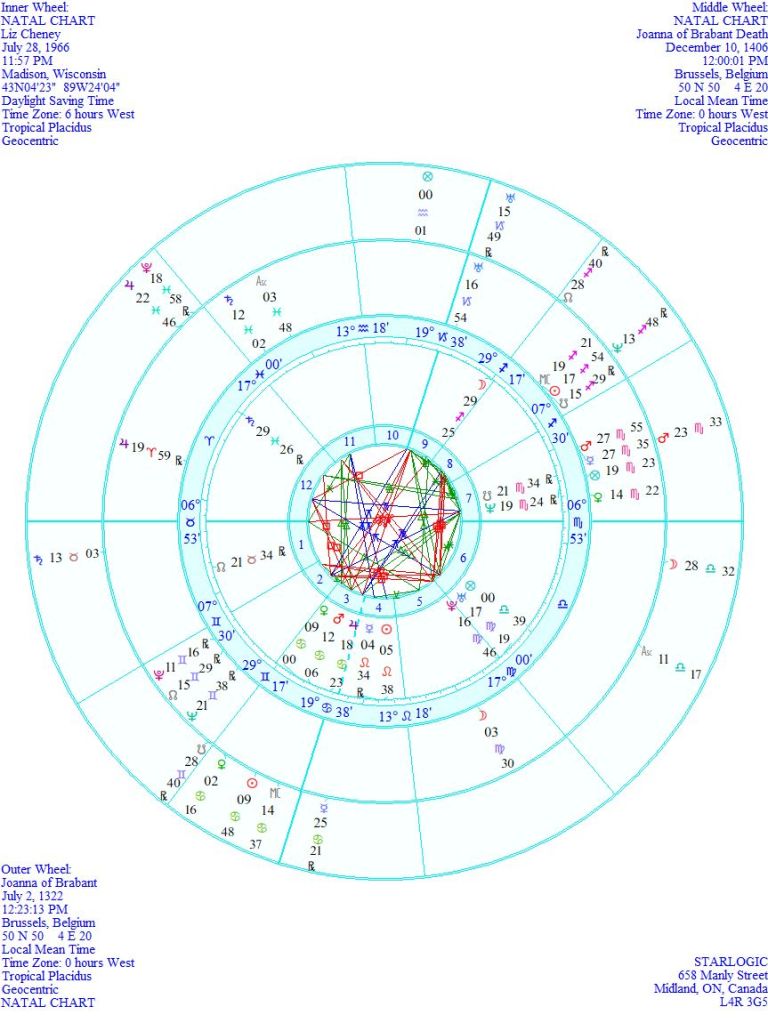 Looks nothing like her, eh? Using the Neptune/South Node positions in Scorpio, I ascertained that the dates 1383 – 1406 AD would be important for the past life of Liz Cheney. When I Googled those dates, this individual was highlighted. Her second husband, Wenceslas, Duke of Brabant died in 1383, she died in 1406. You can’t get it any clearer than that.
