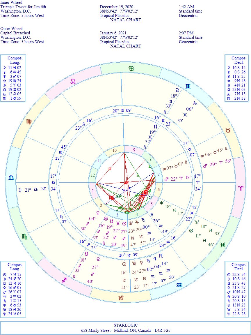 I originally combined these two charts yesterday before writing my post about Trump’s tweet. I decided to omit them, because I thought they might muddy the waters (especially since the slow moving planets had hardly shifted between the two dates). But, today, I feel ready to point out the obvious ‘trigger’: the ‘breach’ Moon @ 21° Libra 52′ conjunct the ‘tweet’ Ascendant and opposite the ‘tweet’ Mars. That, together with the ‘breach’ Ascendant opposing the ‘tweet’ Venus, shows how that ‘innocent’ internet message unleashed so much anger and frustration. The poison of the “Big Lie” had infected Trump supporters into going to war for him. The Oath Keepers must have switched their allegiance from their country to their Supreme Commander, and Trump must have known they were willing to die for him.