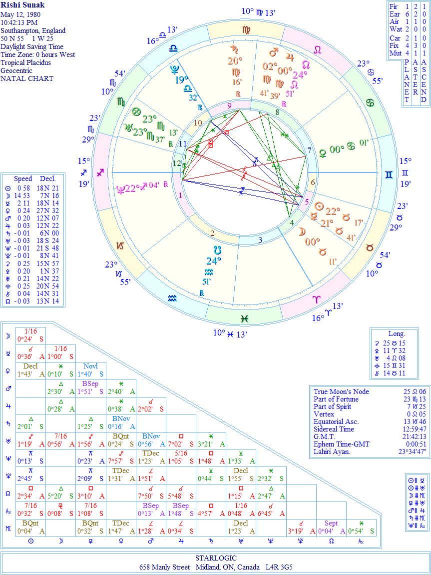 Sunak‘s birth time is not known. (In my opinion, a prerequisite of public office should be the publication of birth details.) Most astrology sites will use dawn as the significant time, but here I have randomized the timing and then flipped AM to PM. That would make this chart more in line with his marriage at age 29 (Venus). There is a double Yod, with neither dependent on an exact birth time.