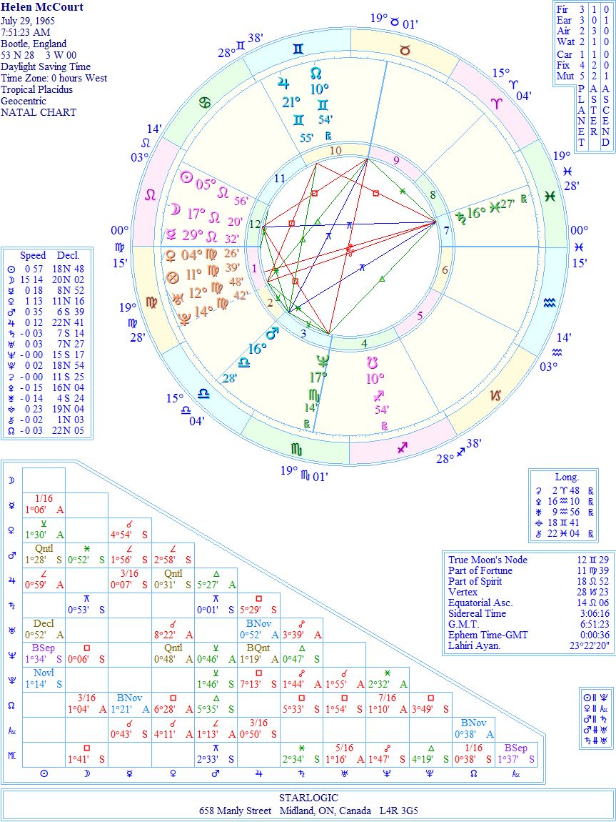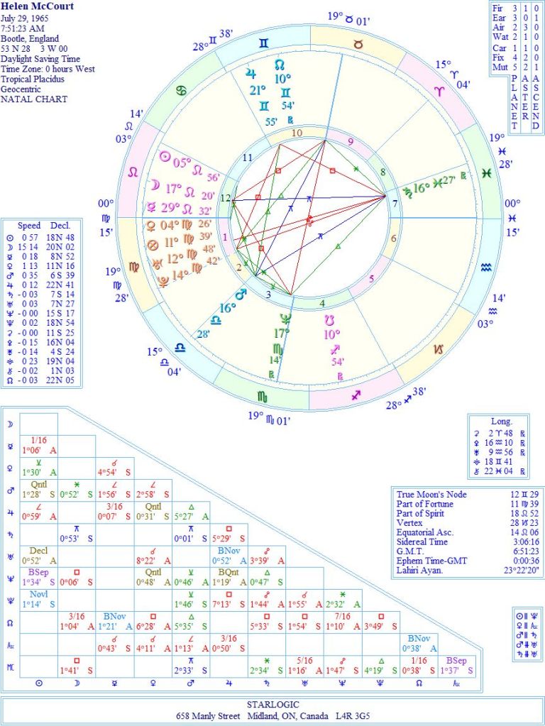 This is a randomized chart. But I wasn’t surprised by the double-ended Yod focused on Mars and Saturn and supported by inconjuncts to the Moon and the Midheaven. The story of her life couldn’t be more clear. However, depending on the actual time of her birth, Helen’s only enduring inconjunct could be between Mars and Saturn.