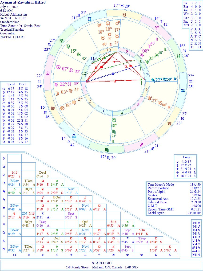 When an event is so specific (and precision-like) the information is exactly correct for our purposes. Mars/Uranus/North Node is conjunct the Midheaven @ 17-18° Taurus! At the same time, the “Great Satan” (Uranus in Aquarius) is almost exactly opposite a Mercury/Ascendant conjunction @ 22° Leo (al-Qaeda). That conjunction is inconjunct Neptune (secret action) in Pisces (the passing of the Age).