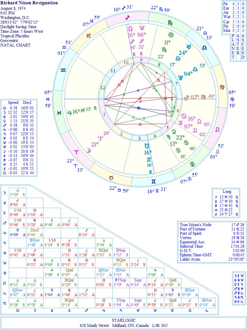 The timing is excellent. And that Yod pointing at the Pisces Ascendant is significant. Having Mars opposing the Ascendant makes it obvious that Nixon had to act when he did. Also the inconjunct between the Sun and Jupiter is echoed in his words: “I have never been a quitter…but as president I must put the interest of America first.”