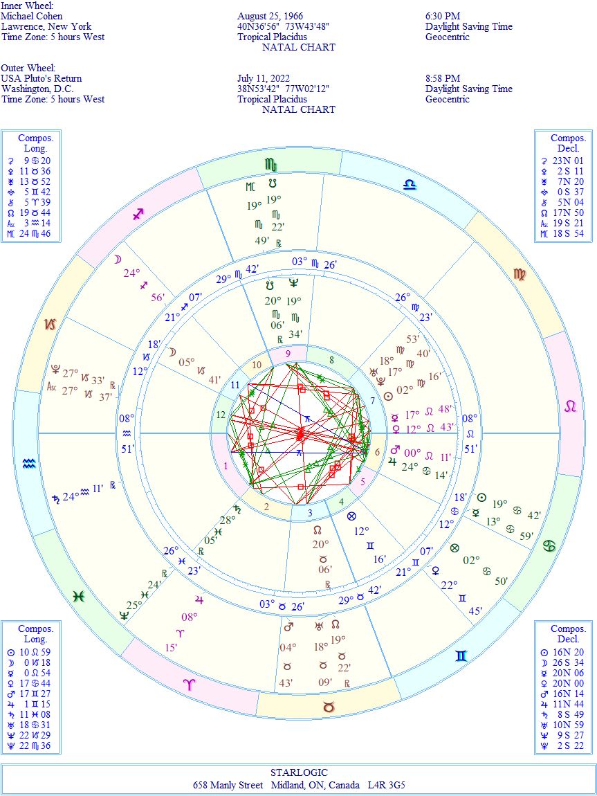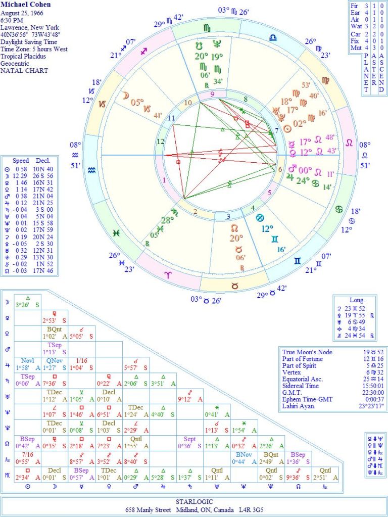 Do you see how the energies align? I suspect the Yod formed from the Pluto Return’s Moon and Saturn @ 24° (Sagittarius and Aquarius, respectively) pointing at his natal Jupiter @ 24° Cancer is the clue to what is going on now. Trump thought he could dump his problems onto Michael’s shoulders and make him the scapegoat. This has boomeranged badly on Trump since no one outside of Trump’s family knows what’s really going on, except for Cohen. That’s why CNN and other media outlets frequently interview him.