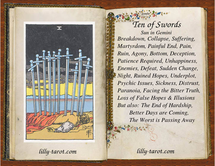 My own Tarot deck is the “Tarot of the New Vision”. Its Ten of Swords image is focused the other way.