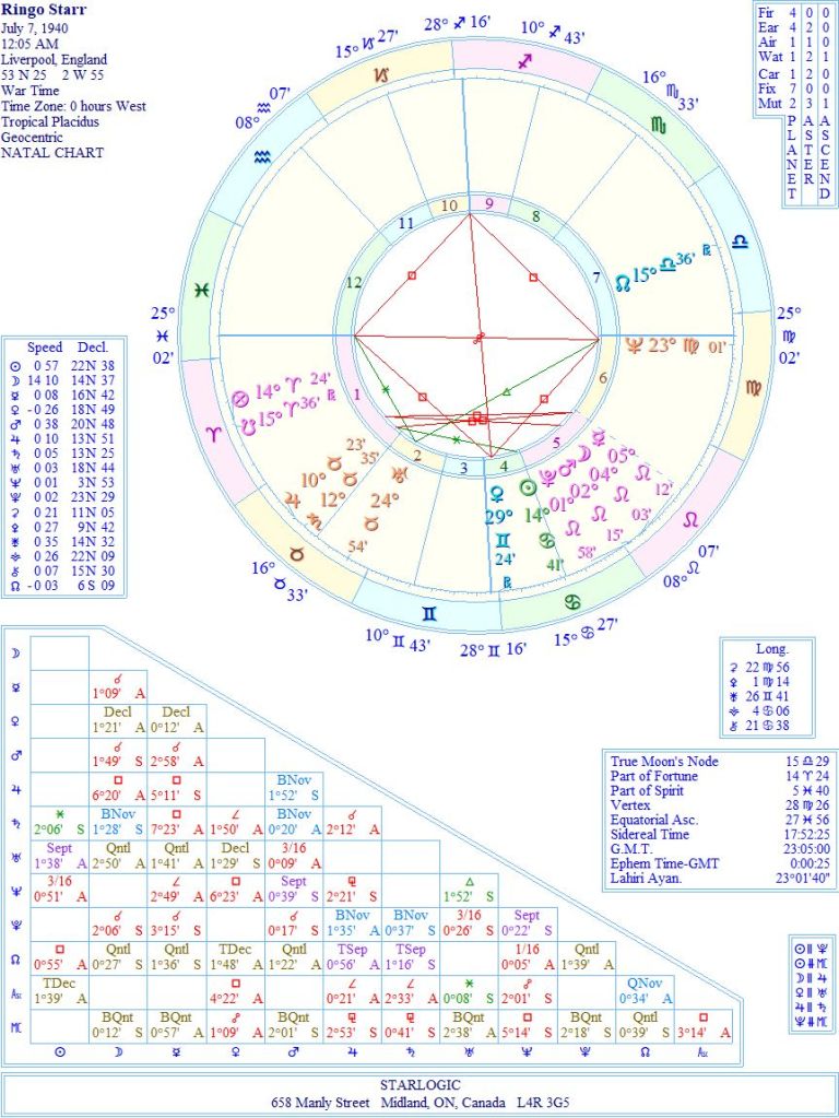 To say the Cosmic Cross of Venus opposition Midheaven square Uranus opposition Ascendant can explain a lot, is an understatement. He keeps time, as evidenced by Saturn in Taurus in the final degrees of a very large 1st House. And the stellium of Pluto/Mars/Moon/Mercury in Leo in the 5th House probably adds weight to the idea of his personality being the most popular of the Beatles, although the others thought otherwise.